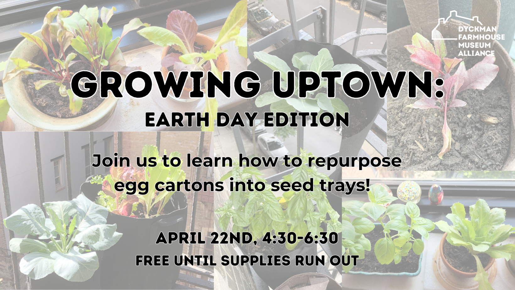 What better way to celebrate the earth than by learning how to grow your own food? Join us to learn how to transform empty egg cartons into seed trays, and kickstart your own at-home garden. There is no cost to this event, but trays and seeds will be provided on a first come, first serve basis. This is part of the Dyckman Farmhouse’s “Growing Uptown” initiative, which aims to minimize food insecurity by empowering residents of Upper Manhattan and the Bronx to grow their own food!